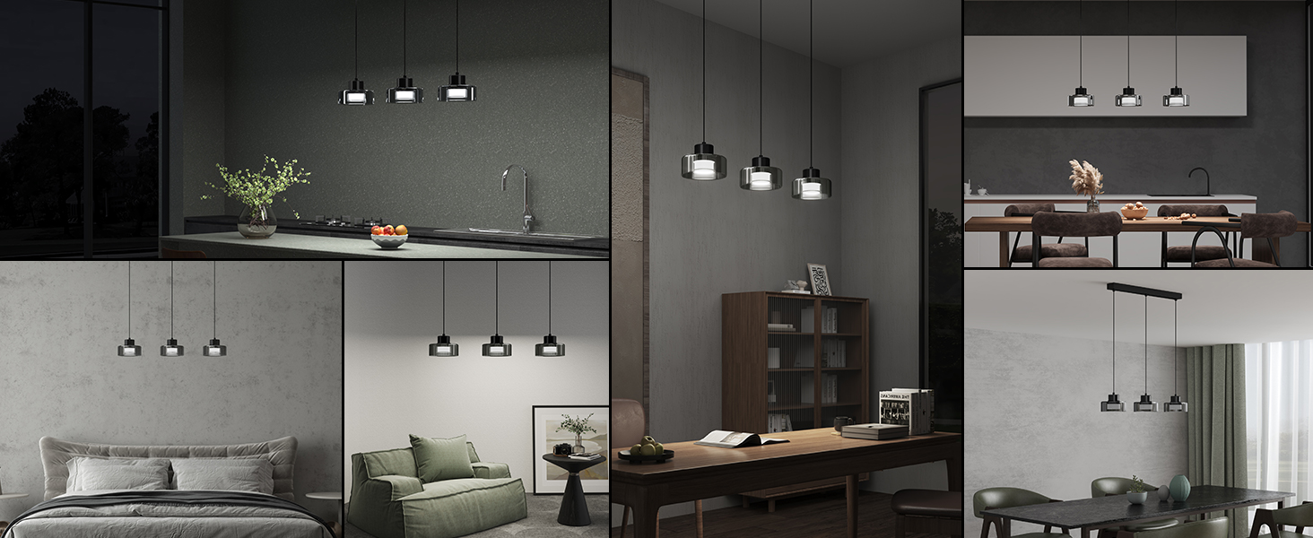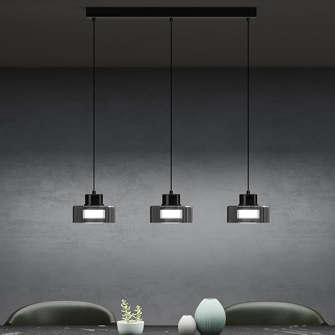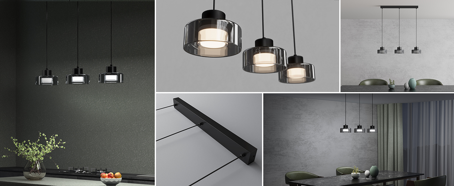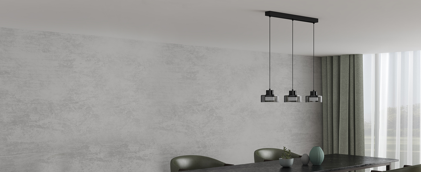 Šviestuvo charakterį formuoja trys modernūs stiklo gaubtai, kurių cilindrinė forma vizualiai pailgina pakabinimo liniją ir sukuria aiškų ritmą. Skaidrus stiklas šviesą praleidžia tolygiai ir švariai, o juodo metalo elementai suteikia konstrukcijai stabilumo ir išryškina minimalistinį siluetą. Šis derinys harmoningai įsilieja į modernius, industrinius ar skandinaviškus interjerus.
