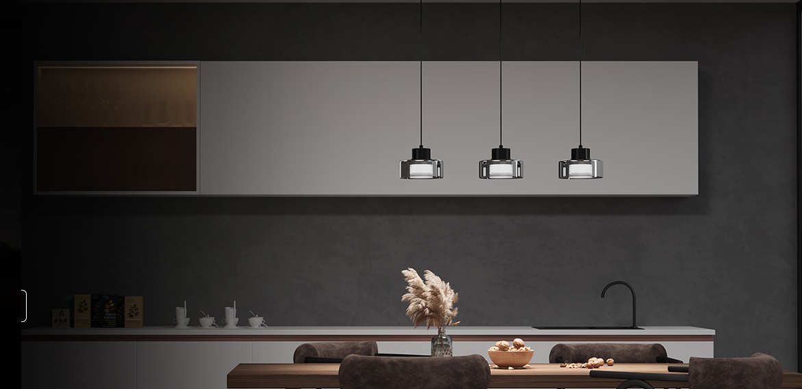 Šviestuvas turi 1 metro reguliuojamus pakabos kabelius, leidžiančius lengvai pritaikyti jo kabėjimo aukštį prie konkrečios erdvės proporcijų. Konstrukcijos ilgis optimaliai tinka montuoti virš valgomojo stalo, virtuvės salos ar kitų vietų, kuriose reikalingas kryptingas, tačiau tolygus apšvietimas. Apšvietimo intensyvumas ir gaubtų išdėstymas užtikrina komfortišką šviesos paskirstymą ~10–15 m² plote.